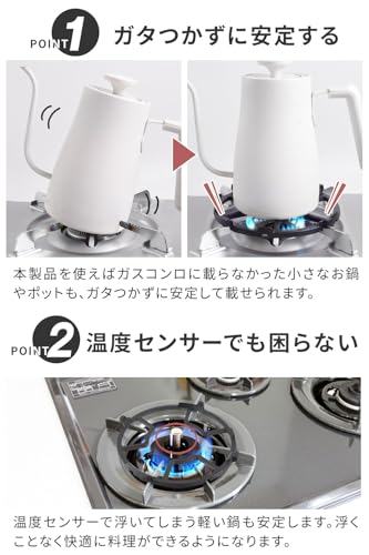 - ガスコンロにのらなかった小さなお鍋やポットがガタつかない! 温度センサーで浮いてしまう軽い鍋も安定します。
