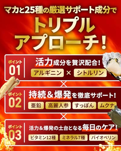 - 🔥【マカと25種類のサポート成分でトリプルアプローチ】マカに加えて、亜鉛、アルギニン、シトルリン、高麗人参、すっぽんなど厳選されたサポート成分25種を配合!🔥【アプローチ①】パワーみなぎる活力成分を贅沢配合【アプローチ②】持続&爆発を徹底サポート【アプローチ③】活力&爆発の土台となる毎日のケア!