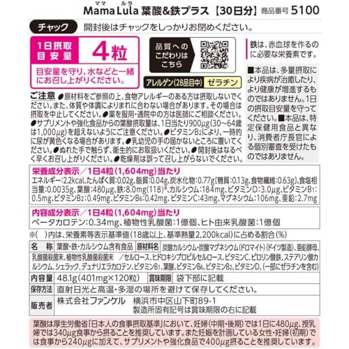 ファンケル (FANCL) Mama Lula 葉酸 & 鉄プラス 30日分 サプリメント (鉄分/葉酸サプリ / ビタミンB6) 妊娠前 妊娠 授乳期のJANコードは【4908049486105】です