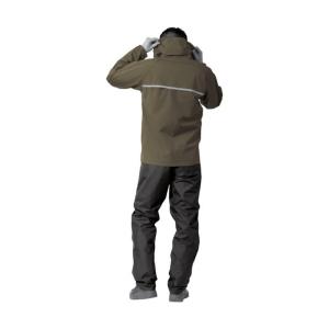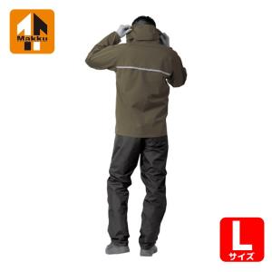 - 【商品仕様】上着サイズ:胸囲118×裄丈85×着丈71㎝/本体パンツ:総丈111×股下75×腰囲108㎝/上着重量:260g/パンツ重量:200g/素材:ポリエステル100%、TPUラミネート/耐水圧:10,000㎜H2O/透湿度:5,000g/㎡-24HR /カラー:カーキ/サイズ:Lサイズ