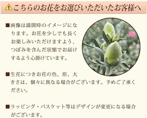 - ※生花につき、商品の色・形・大きさは、写真と異なる場合がございます(画像は満開時のイメージです)。お花は、つぼみを含んだ状態でお届け致します。花器・ラッピングのデザインが変わる場合がございます。※請求書・納品書など、商品の金額が分かる明細書は同梱しておりません。ギフト設定をされていない場合でも、明細書等は同梱いたしませんのでご安心ください。置き配は、当店では対応しておりません。配達員が直接お渡しさせて頂きます。商品発送後にお届け先ご住所間違い、長期不在、転居等の理由で届け先変更(転送)が生じた場合、転送にかかる送料を転送先にてご負担(着払い)いただきます。