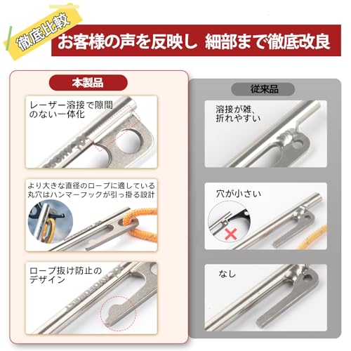 - ✅強度があるのに軽い: チタンペグは、どんな硬い地面でもガンガン打ち込める強度は抜群です。 鋳造ペグに負けない強度を持ちながら重さはその半分から3分の1にもなります。