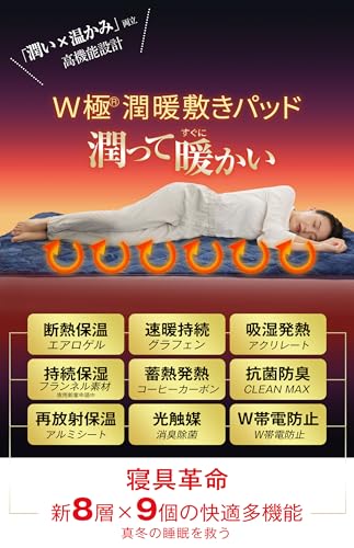 - 【暖かいだけじゃない!潤暖敷きパッド冬用】冬の「暖かさ」だけでなく「肌の潤い」も求めるなら、このW極🄬モイストフレア潤暖寝具で、乾燥や冷えによる肌の悩みを一掃し、6つの先端テクノロジーが届ける「潤いあふれる暖かさ」を体感してください。独自に開発した業界初となる「持続する水分保持フランネル機能生地」が、独自の技術で超保湿成分を分子レベルでナイロン繊維に定着させ、肌に薄い「潤いの膜」をかけるような奢らかな体感をお届けします。さらに CICA 保湿加工を施すことで、ダブルの保湿効果で、肌が敷きパッドに触れる瞬間から、スキンケア成分が肌をしっかり保護し、自生の潤いを逃がさないようキープ。柔らかさが肌に密着するように寄り添い、寝ている間に自然に潤いを補給してくれるため、冬の乾燥によるチクチク感が一掃されます。冬の二大敵「冷え」と「乾燥」、潤暖 冬用敷きパッド一つで完璧対策!