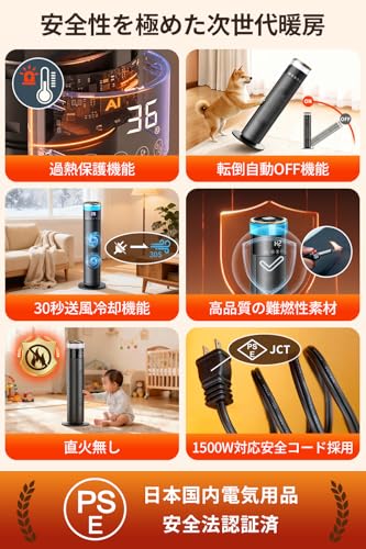 - 【多重安全設計×PSE認証済、家族を守る安心ヒーター】本体が転倒したり、40℃以上傾くと自動で電源が切れる転倒自動OFF機能や、温度が上がりすぎた際に運転が停止する過熱保護機能を搭載し、安全性を徹底的に強化しています。また、電源を切ると30秒間の送風冷却を行い、内部の熱を逃がして本体を守ります。ボディは高品質の難燃性素材を採用しており、長時間の使用でも焼け焦げるような異臭が発生せず、安心してご使用いただけます。電源コードは1500W対応で設計され、最大1200W運転でも余裕を持ってカバーします。長時間の稼働でも発熱や劣化を防ぎ、安定した電力供給を確保します。灯油やガスを使わない電気式なので直火が発生せず、一酸化炭素中毒のリスクもありません。丸みを帯びた優しいフォルムは小さなお子様やペットのいるご家庭でも安心です。さらに本製品は電気用品安全法に基づくPSE認証を取得しており、安全性と信頼性が保証されています。