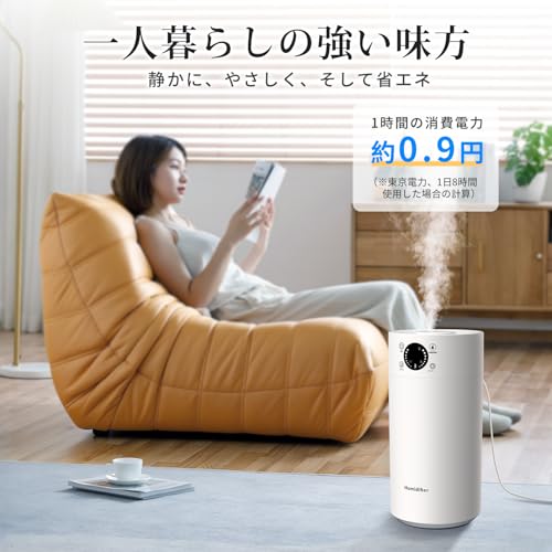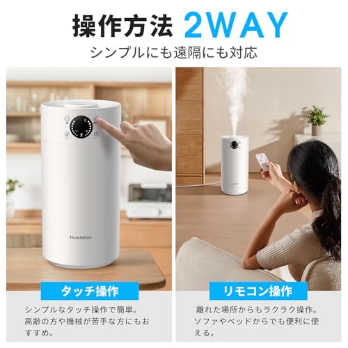 - 【遠隔で好みの空間へ:便利なリモコン操作&安心の空焚き防止】弱・中・強の3段階ミスト調整機能と、専用リモコン、空焚き防止機能を備えています。お部屋の広さや天候に合わせて加湿量を調整でき、ソファやベッドから一歩も動かずに遠隔操作が可能です。 いつでも自分の周囲を最適な快適空間にカスタマイズでき、日々の使い勝手が格段に向上します。タンクの水がなくなると自動で運転を停止するセンサー(空焚き防止)を内蔵しているため、外出時や就寝中も安全です。